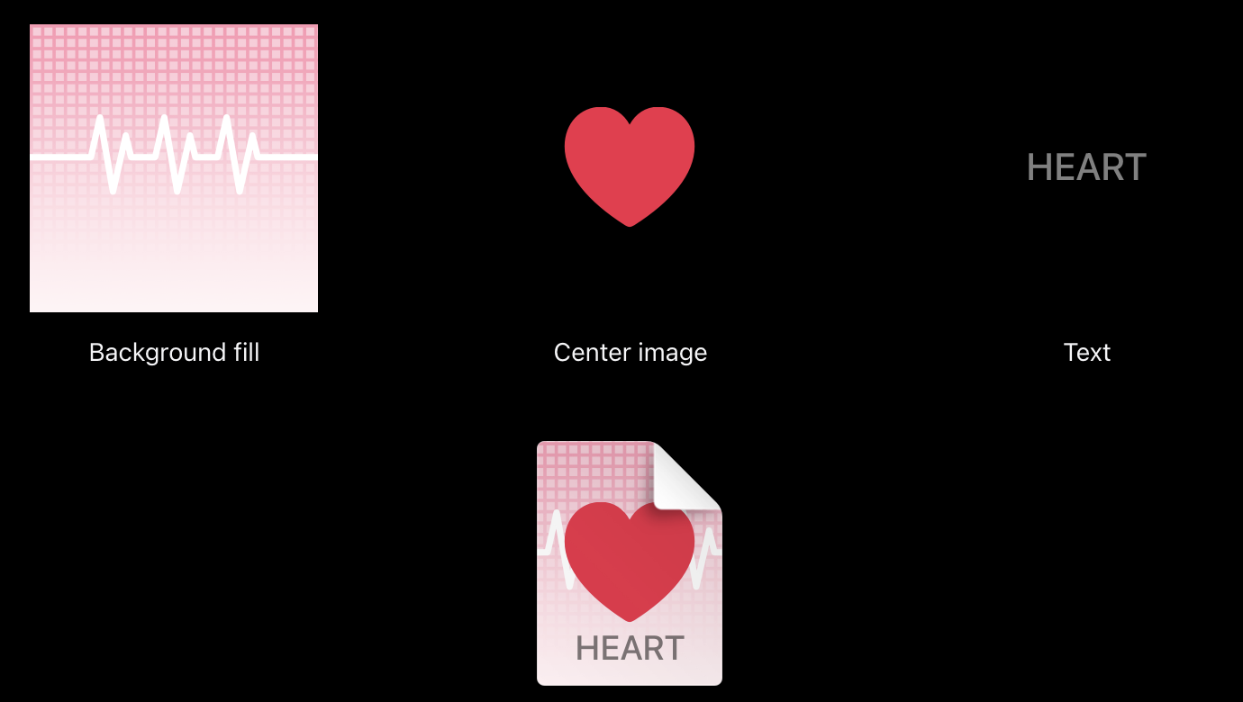 To create a custom document icon, you can supply any combination of background fill, center image, and text. The system layers, positions, and masks these elements as needed and composites them onto the familiar folded-corner icon shape.